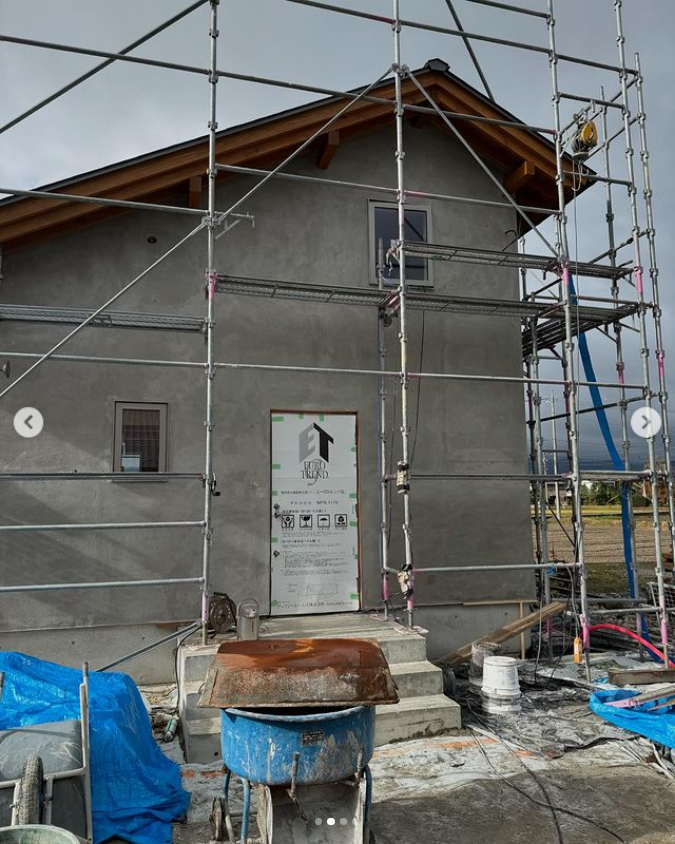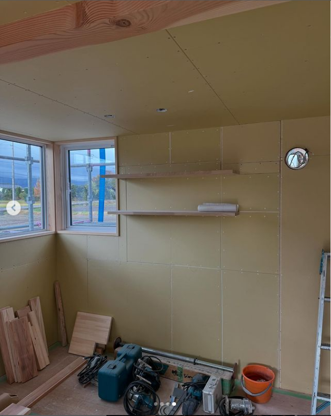 内部は先付けの棚、造り付けの家具を納めてから壁のボード張りです。