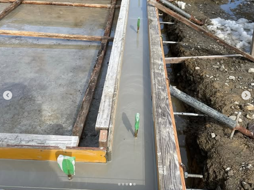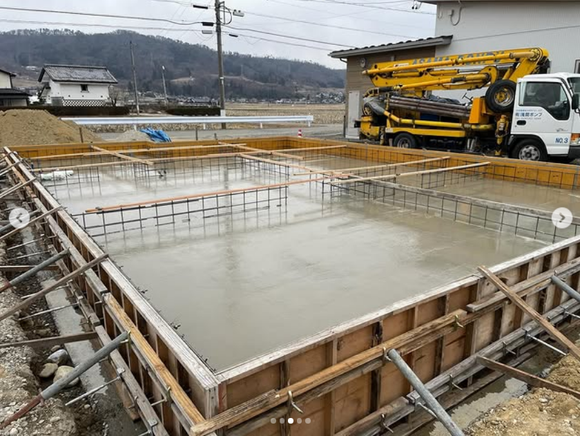 基礎工事⑴ 2025年3月23日 基礎工事です。コンクリートの中に温水を回すパイプを入れてました。床下空間から温める床暖房。床材の直ぐ下ではありませんので、県産材の赤松のフローリングで仕上げます。現在コンクリート養生中です。