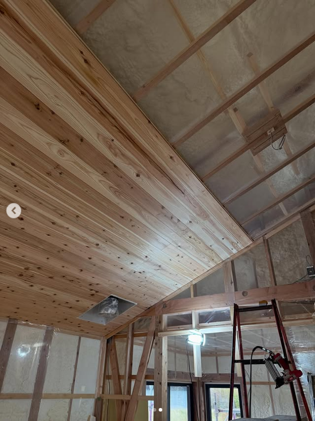 外壁の杉板張り(ウッドロングエコ) 2025年10月22日 お久しぶりです。投稿はサボってましたが、仕事は一所懸命しております。外壁の杉板張りです。塗装は経年変化を楽しむ、ウッドロングエコ。施主さんのセルフ塗装です。一部室内天井にも杉板を使ってます。