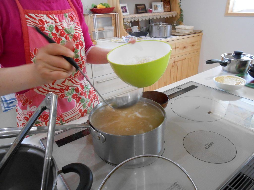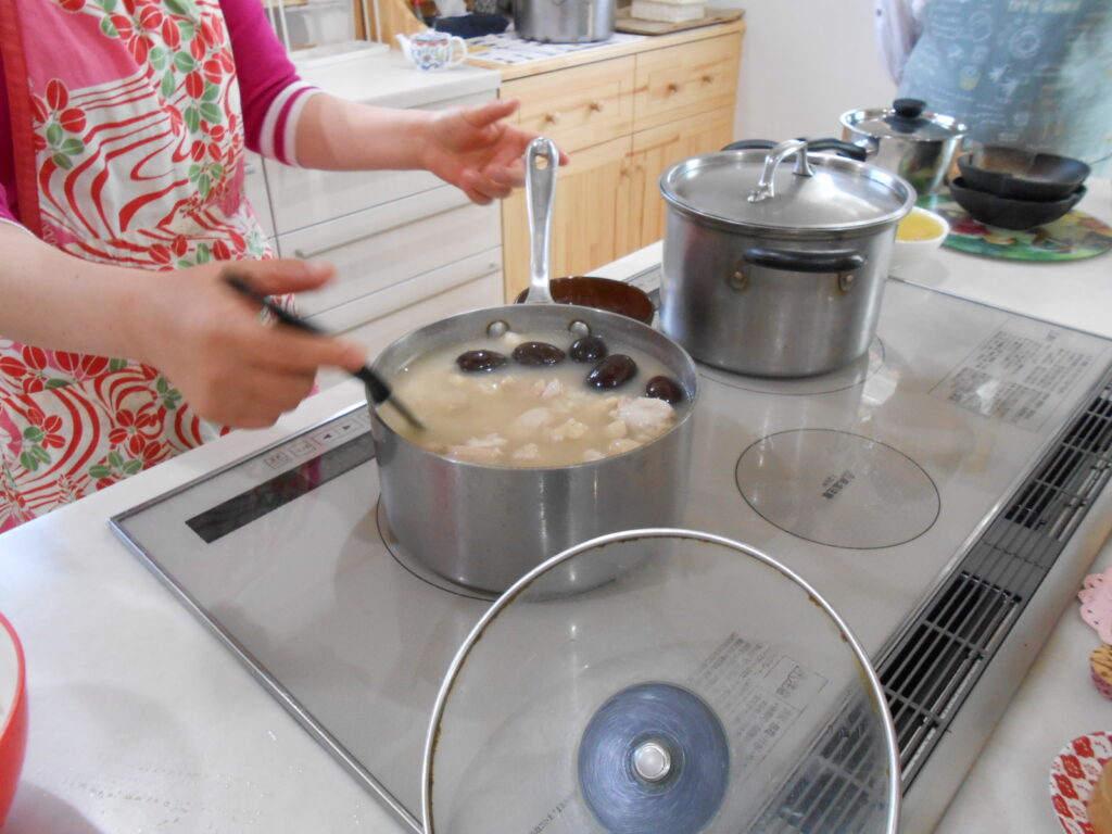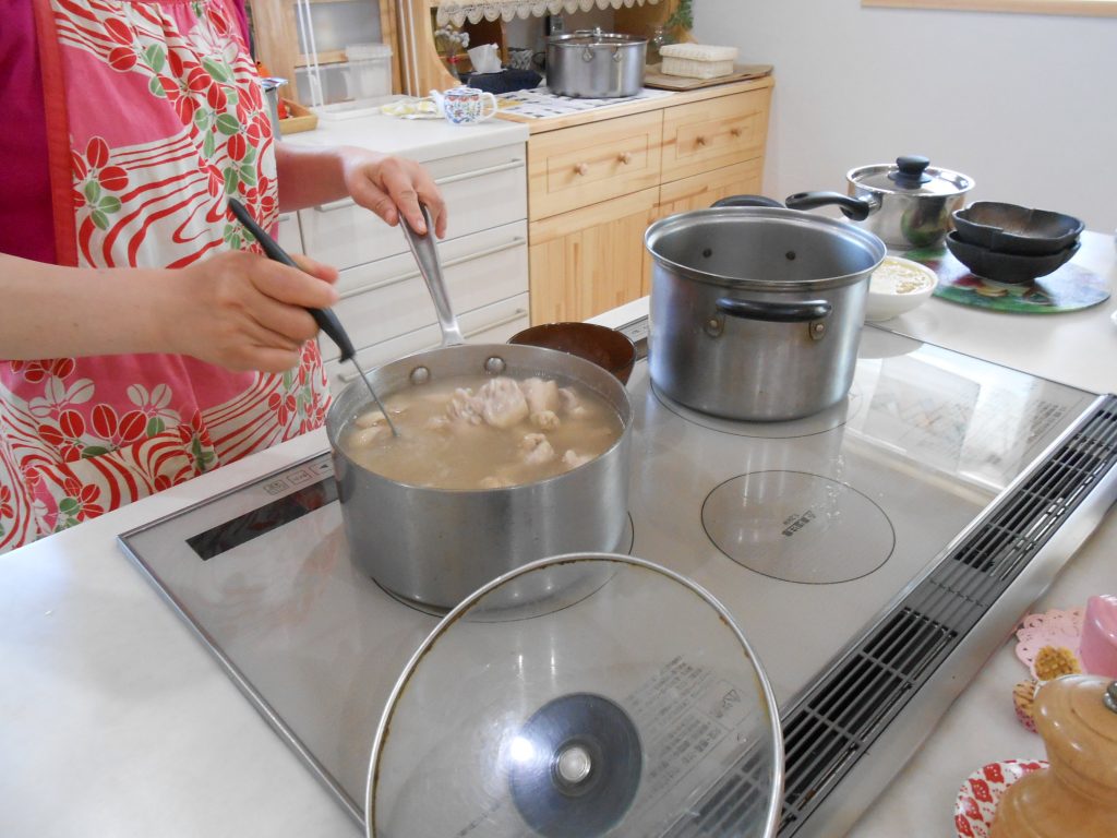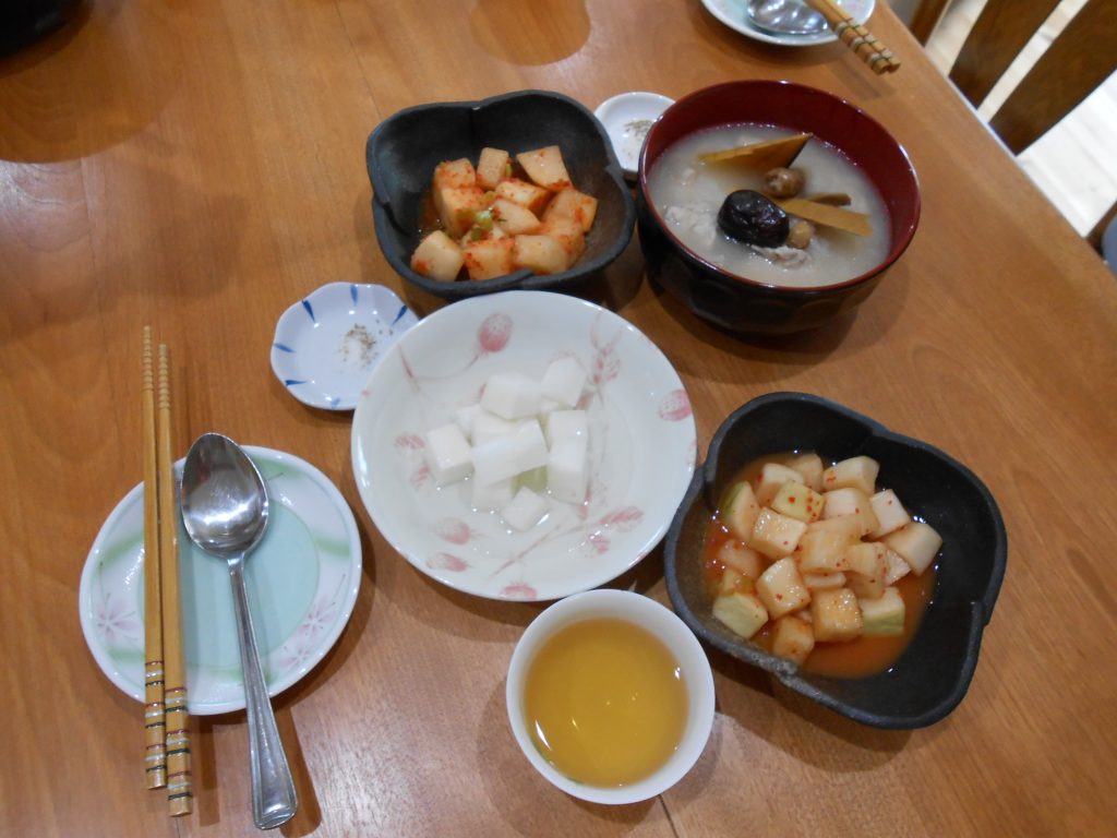 サムゲタン お料理講習会に参加 2017年6月20日 さて、料理の始まりです。ニンニク、ナツメ、朝鮮人参 などでスープを煮出す。鶏肉をきれいに洗い、油をすべて取り除きます。 もち米を入れます。 出来ました。 鶏肉を漢方スープともち米で煮込んだお料理 スープに塩と胡椒、柔らかい鶏肉もとりだして塩と胡椒をつけていただきました。 とてもやさしい味でおいしかったです。からだがポカポカしてきました。 大根のキムチも簡単でさっぱりしたお味でした。 サムゲタン 夏バテ防止にいいそうです。 崔 寧純 さんのおうち にて