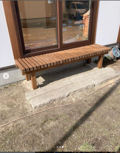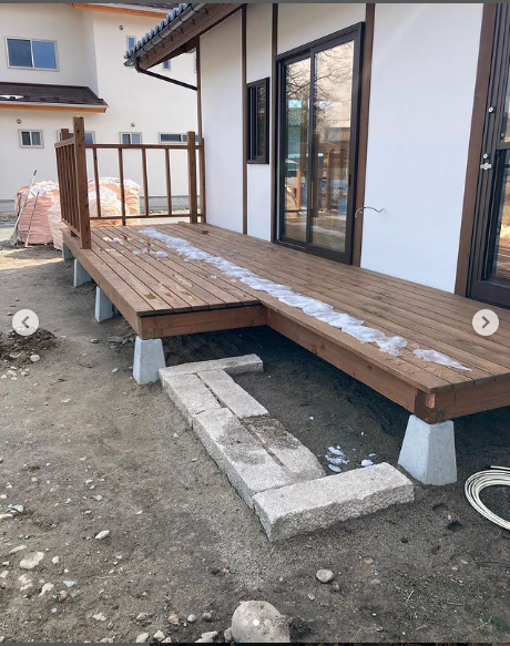 ポーチのタイル貼り、リビングからの濡れ縁、デッキは階段をつけます。