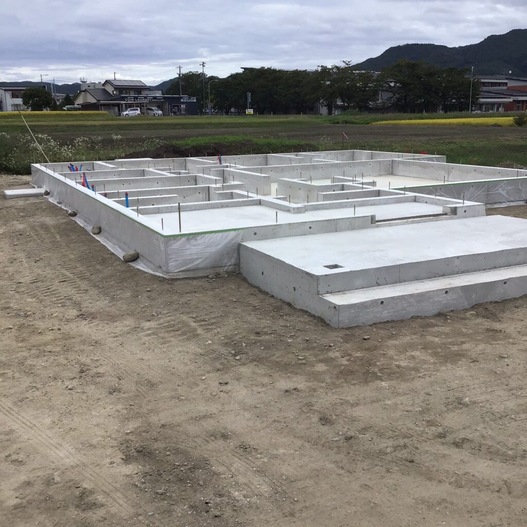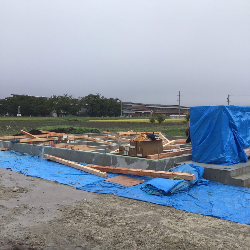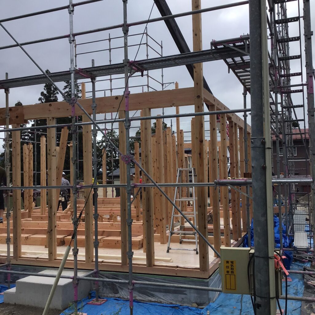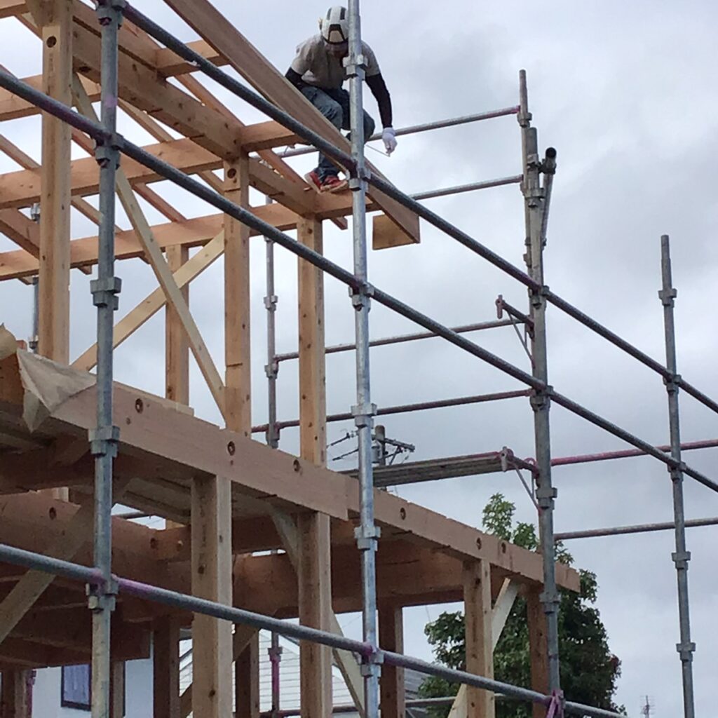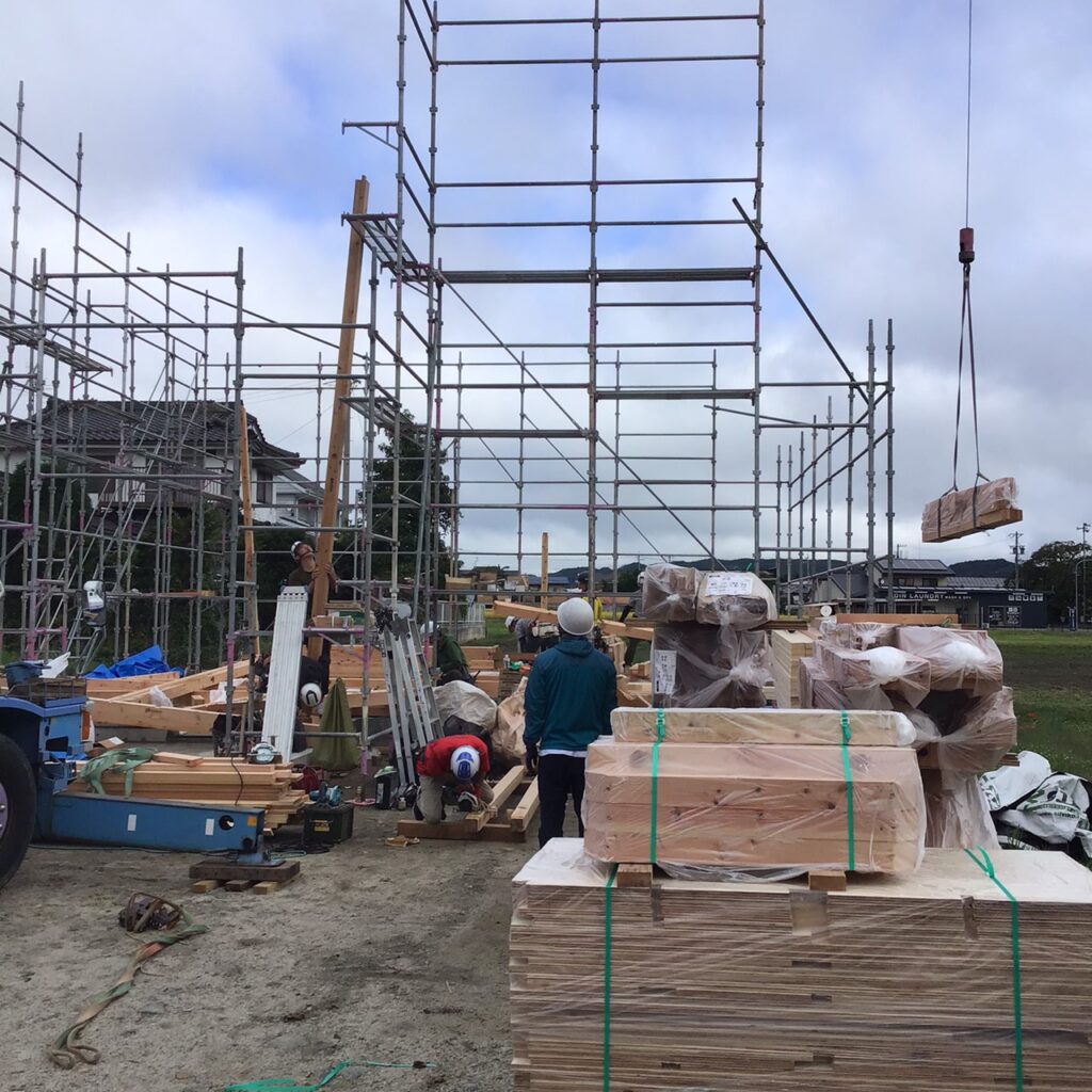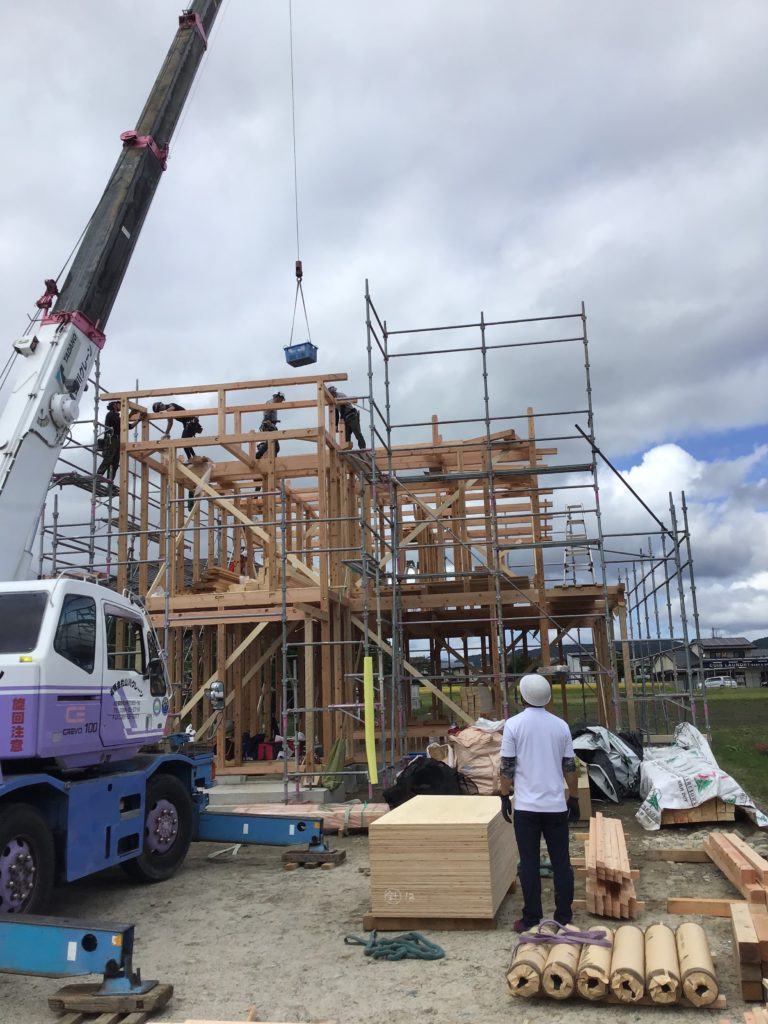 大町の現場 2020年9月30日 少し間が空きました、その間にも現場は進みます。基礎が出来あがりましたので土台を敷いて建方です。建方はクレーン車使っての工事になります。皆さん気を付けて作業をお願いします。柱を所定の位置に立てます。それから横架材、桁・梁を柱のホゾと合わせて接続させます。3時間ほど現場を離れたら2階の桁まで組み上がっていました。垂木を設置して破風板の取付け、そして屋根下地を打ち付ければ本日の作業は終了です。皆さんご苦労様でした。