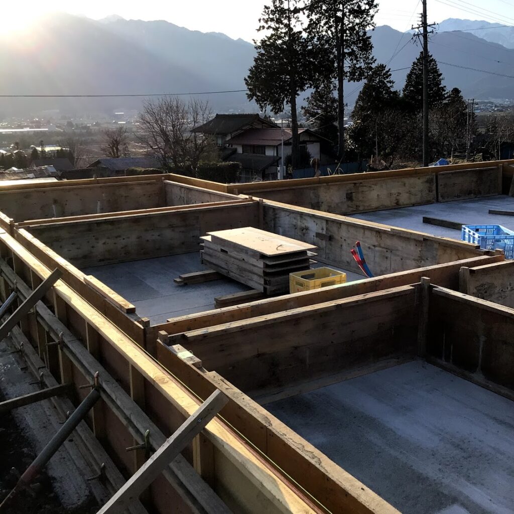 型枠が西日で輝いています。