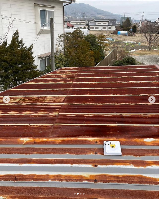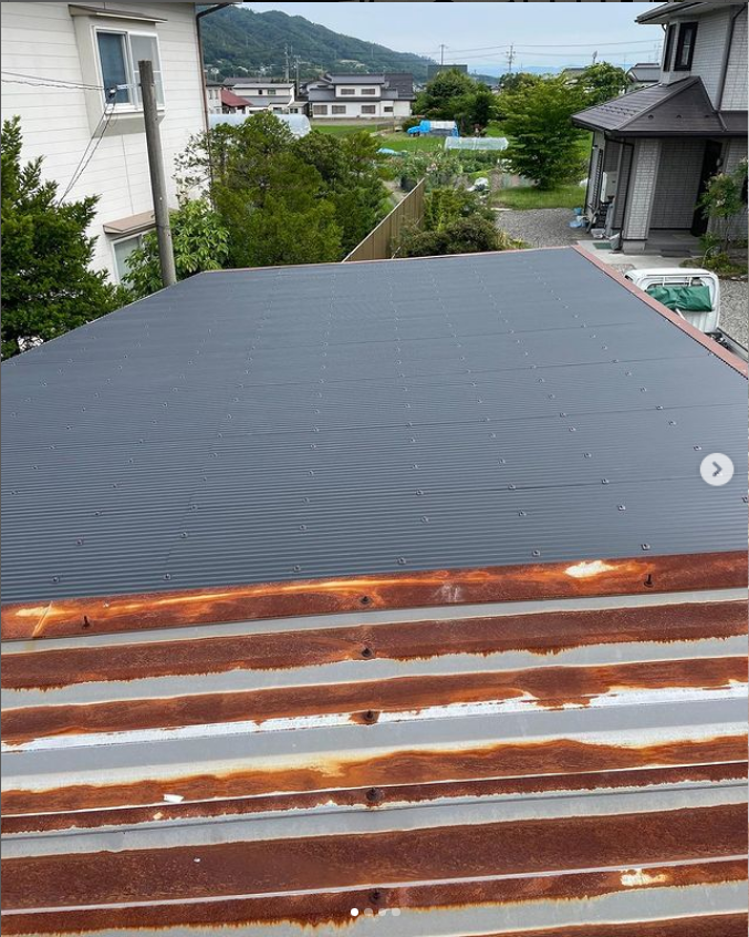 屋根の張り替えと塗装メンテナンス 2024年7月24日 屋根の張り替えと屋根の塗装メンテナンスです。貼り替え工事の方は余りにトタンの錆が進んでいて、塗装だけでは心もとない下地でした。工事代金も波トタン張り替え工事の方が費用がかかりました。皆さん屋根は錆が出る前にメンテナンスしましょう。