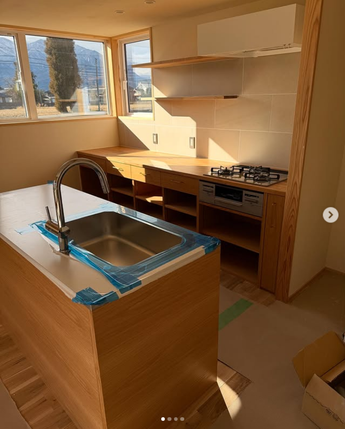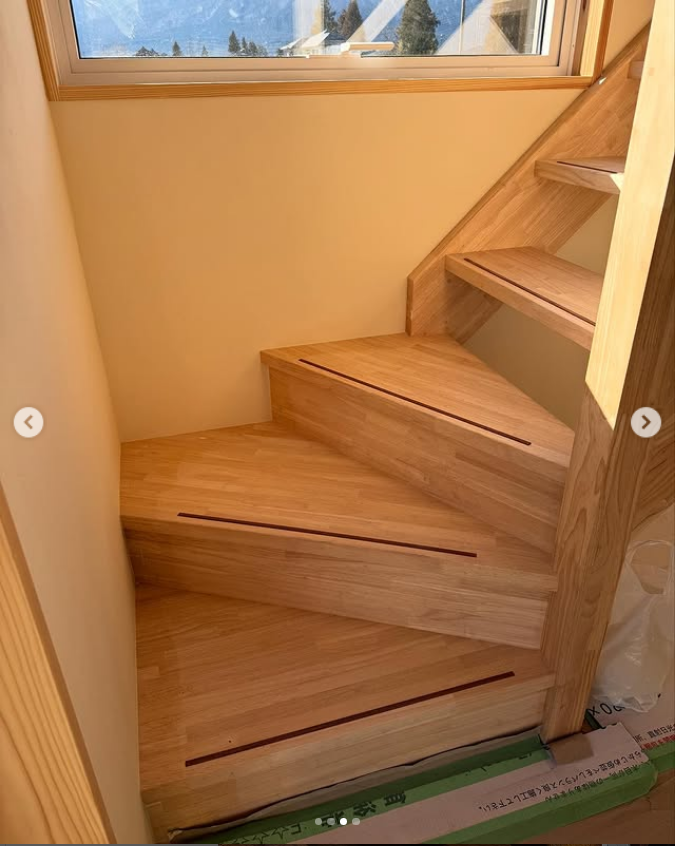 造り付けの家具です 2025年1月14日 キッチン設置、家具屋さんへオーダー。階段のノンスリップはチーク材を埋め込みました。素材の色違いがアクセントになりました。流し台で洗い物しながら外が感じられるレイアウトになっています。